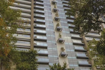 El edificio ofrece amenidades premium: gimnasio, alberca, spa con sauna y vapor, cine, bar, salas de juntas y seguridad 24 horas.